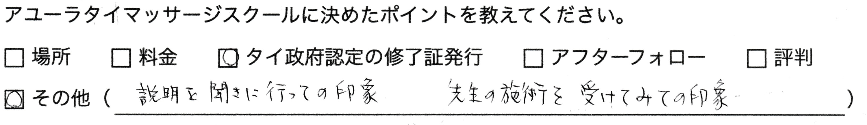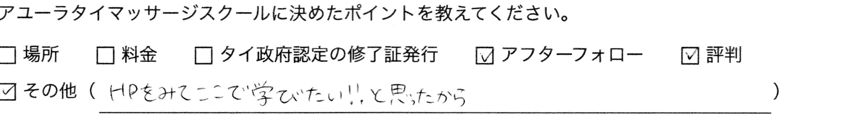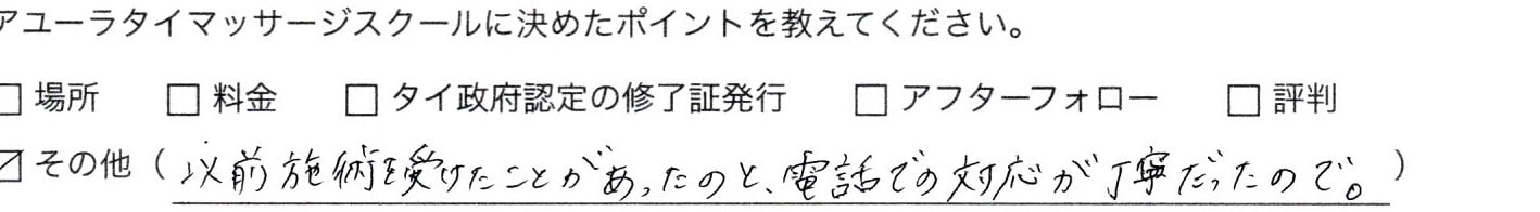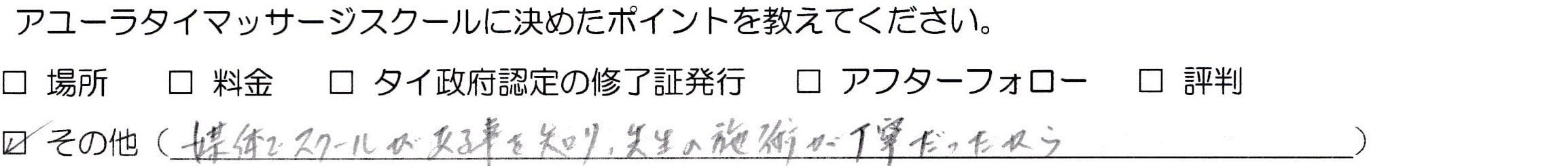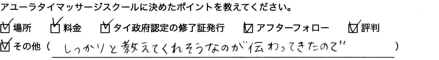 とても丁寧で分かりやすい指導のおかげでセラピストとして働くことができるようになりました。先生の授業で、タイマッサージの楽しさを教えていただいたことで楽しく働くこともできています。スクールはDVDもついているので、予習、復習にとても役立ち勉強にもなります。細かい質問にも大変丁寧に答えていただきました。ありがとうございました。