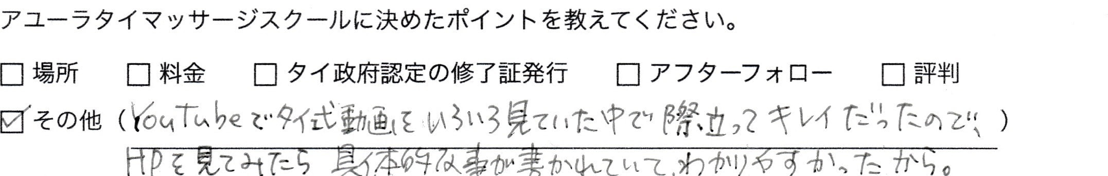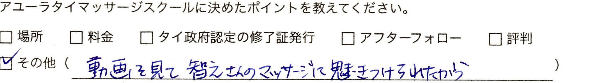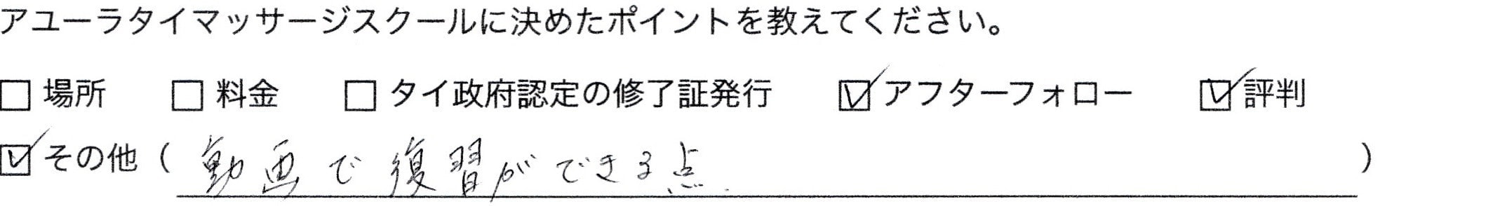 以前、タイ古式の仕事をしていたのですが、知識など何もなく、自信もなく、気持ちいいのかさえ分からなかったので、ちゃんと学び、またタイ古式をやってみようと思い受講しました。他のスクールにはない動画付きにして本当に良かったです。いつでもどこでも「あっ分からない」と思えばすぐに確認ができ、卒業してもずっと見れるのは安心です。授業中にメモするの必死!!ってことにもなりませんでした。アユーラさんに決めるまでに色々と違う先生のところへ受けに行ったのですが、技術の差が全然違いました。先生に教わることができて良かったです。