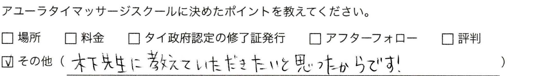 初めてタイマッサージを受けた時、他のマッサージ(もみほぐし、エステ)とは何か違うリラックス効果とスッキリした感じがあり興味を持ちました。まったく違う職業からタイマッサージへの転職で分からないことが分からない状態でしたが、木下先生に骨や筋肉、身体の仕組みなど細かく丁寧に教えてもらいとても分かりやすかったし、もっと学びたい、ここをもっと勉強しよう!!という気持ちになりモヤモヤしていたことがスッキリしました。