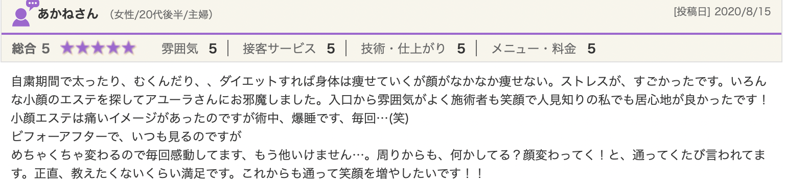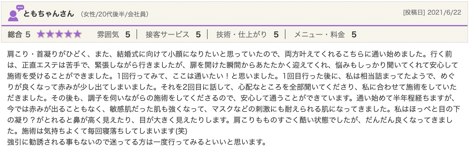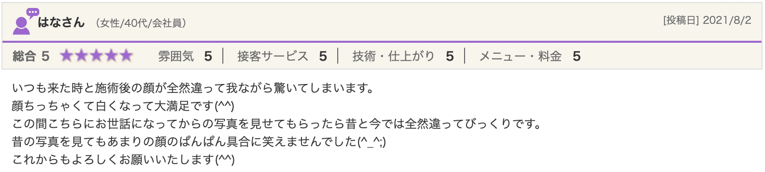 周りからも、何かしてる?顔変わってく!と、通ってくたび言われてます。正直、教えたくないくらい満足です。これからも通って笑顔を増やしたいです!!