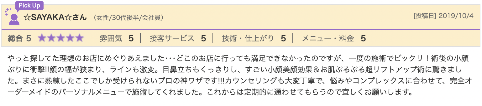 どこのお店に行っても満足できなかったのですが、一度の施術でビックリ!術後の小顔ぶりに衝撃!!