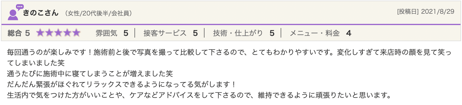 施術前と後で写真を撮って比較して下さるので、とてもわかりやすいです。変化しすぎて来店時の顔を見て笑ってしまいました(笑)