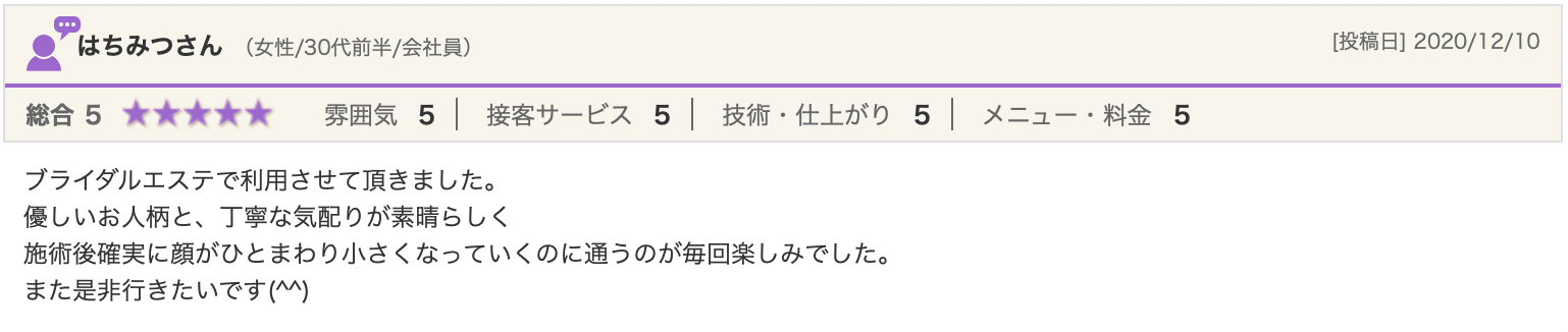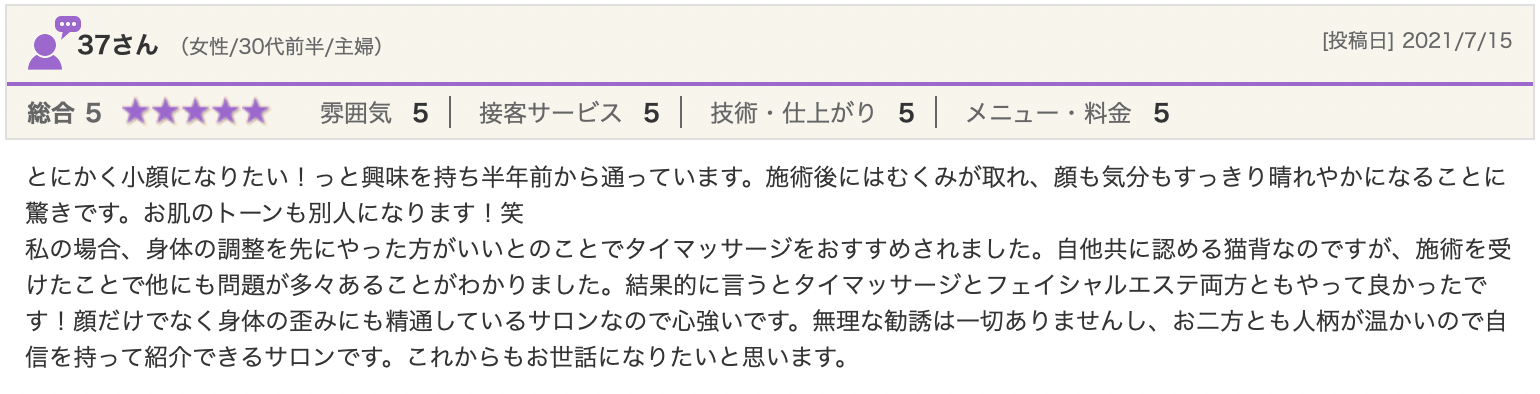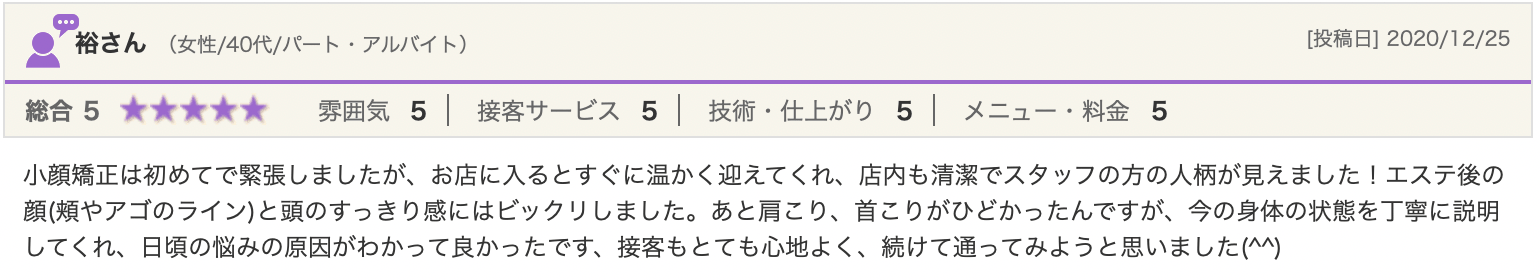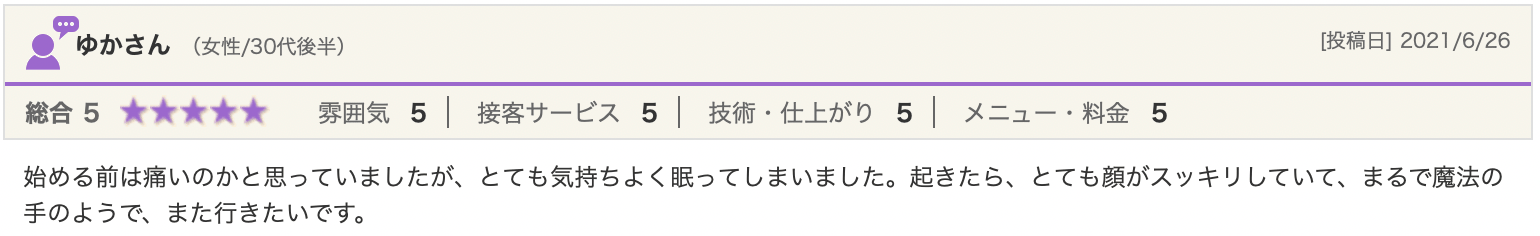 入口から雰囲気がよく施術者も笑顔で人見知りの私でも居心地が良かったです!小顔エステは痛いイメージがあったのですが術中、爆睡です、毎回…(笑)