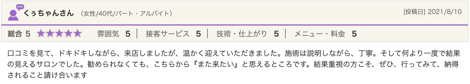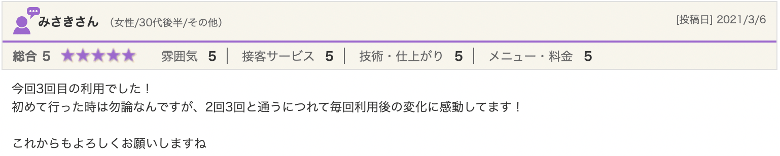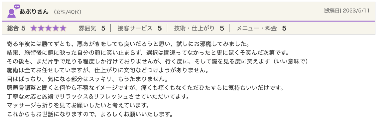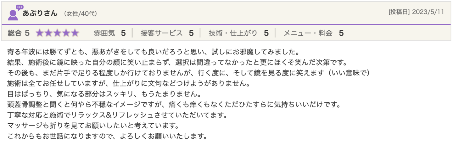 施術は全てお任せしていますが、仕上がりに文句などつけようがありません。